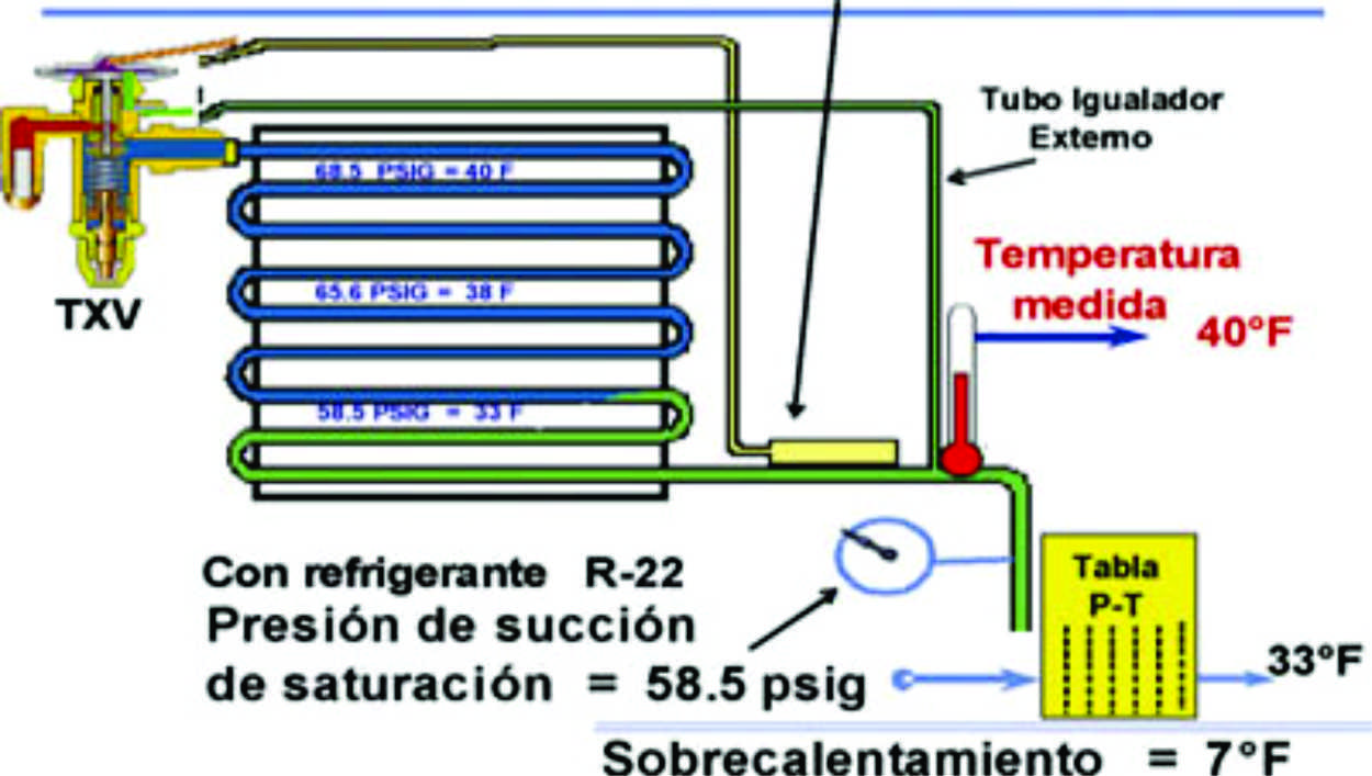 Como ejemplo en la Fig. 3, se observa una caída de presión en el evaporador de 10 psi (68.5 – 58.5). Cuando se usa refrigerante R-22, la presión P2 abajo del diagrama es 58.5 psig (detectada a través del tubo igualador), la que corresponde a una temperatura de saturación de 33°F (en la tabla P-T) del refrigerante R-22, por lo tanto el sobrecalentamiento a la salida del evaporador es la temperatura medida de salida del evaporador de 40°F menos la temperatura de saturación de 33°F, e igual a 7°F (40 °F – 33°F).